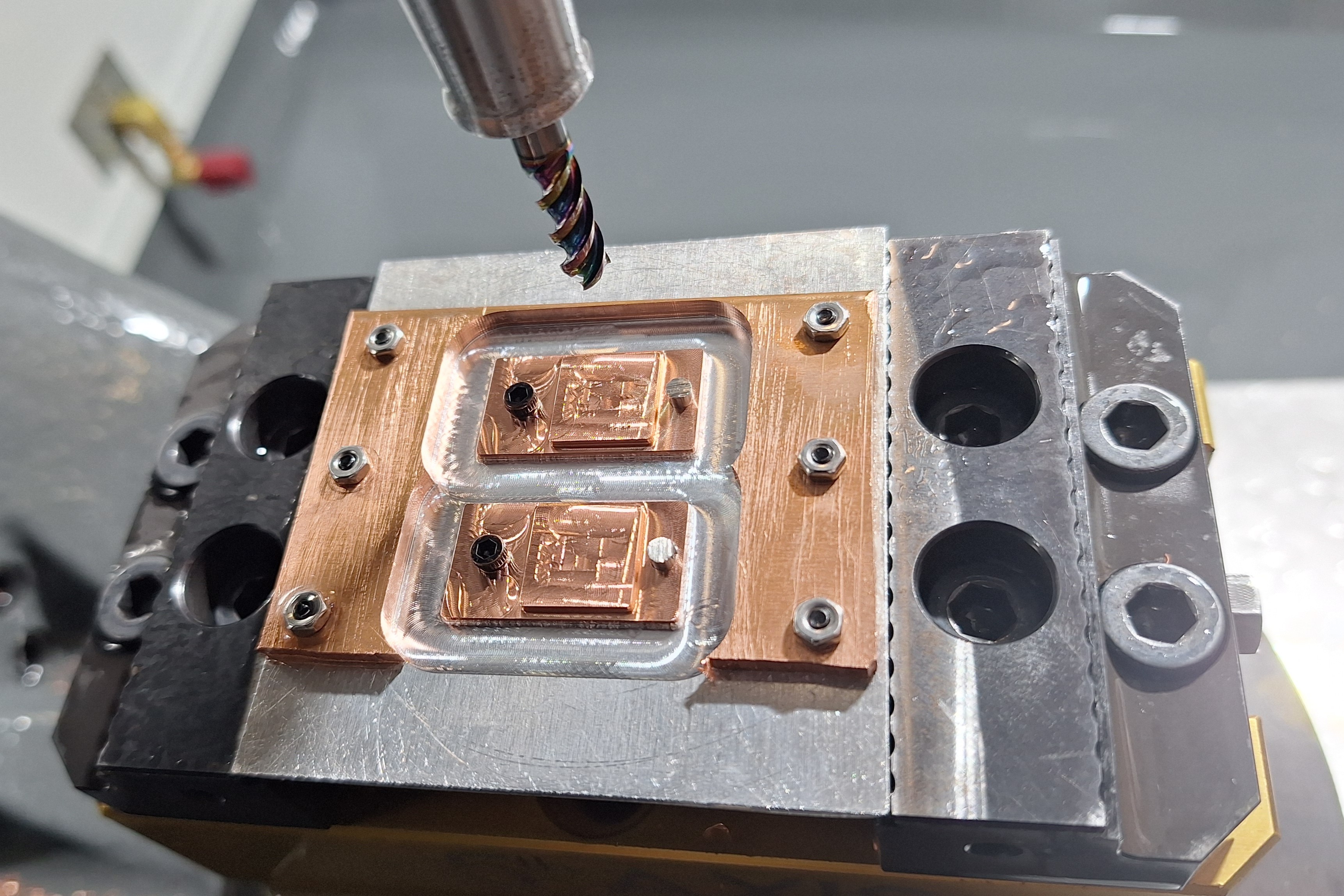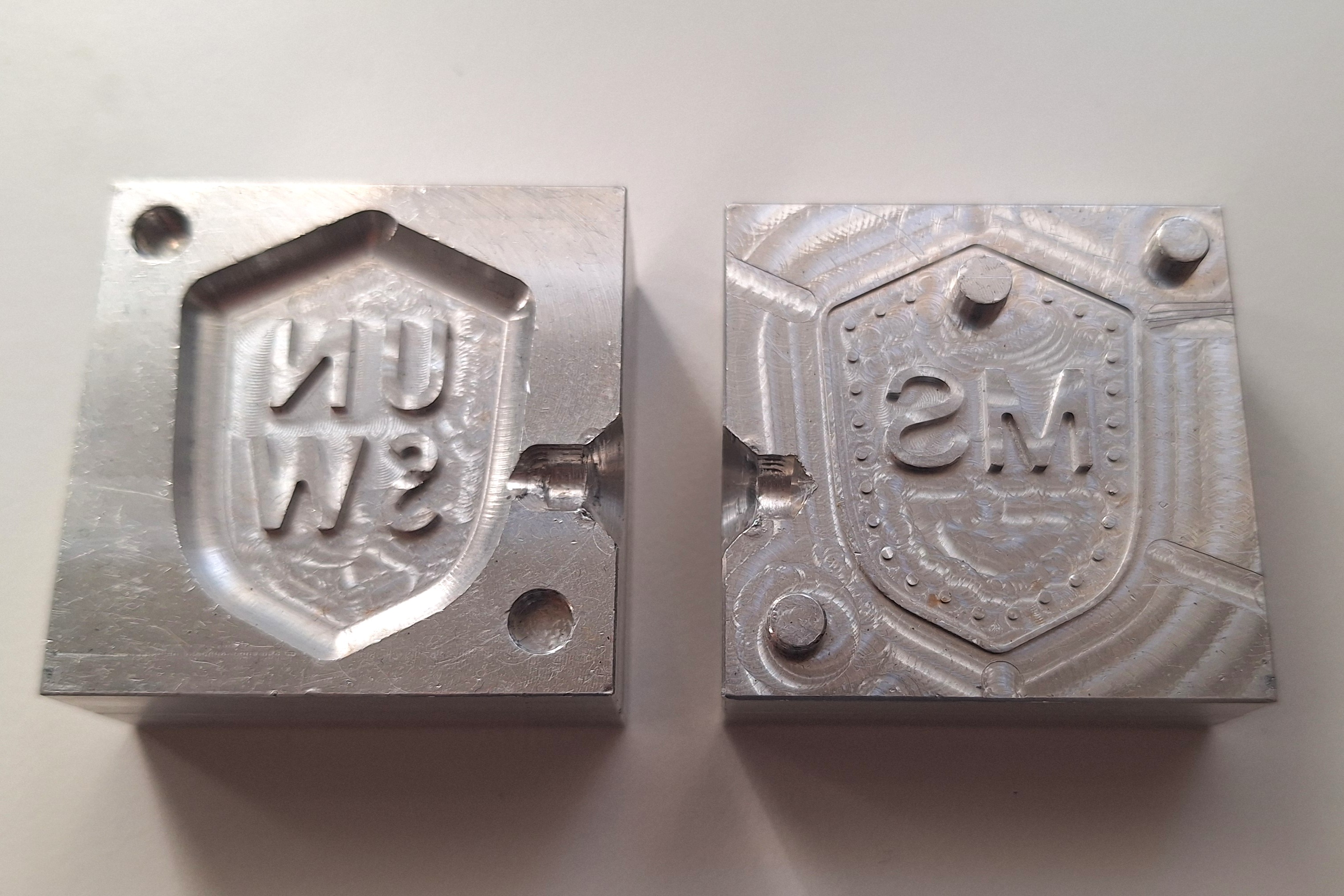 To learn more about injection moulding I designed and made a small injection mould for a keychain badge. I designed it with a large fillet on the inside to replace a draft angle, because we didn't have any tapered tools. Some of the small details had straight sides but didn't grip too strongly to the plastic because they were below 0.5mm height. I also cut shallow air channels between the cavity and outside to allow venting when the plastic is injected.